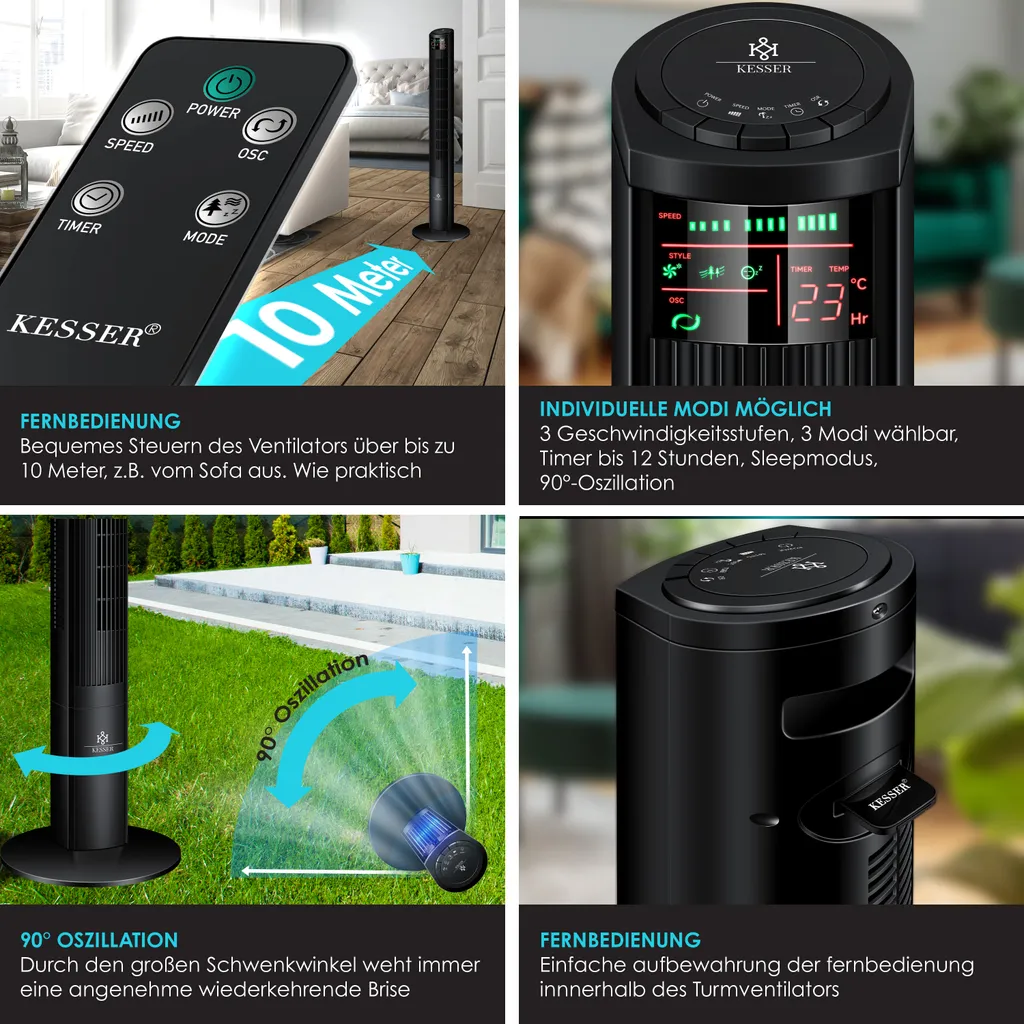 KESSER® Turmventilator Mit Fernbedienung | 120 Cm | Oszilation | 55W | LED-Display | Ventilator Mit 3 Geschwindigkeitsstufen + Timer Bis 12 Stunden + 3 Betriebsmodi + 90° Oszillierend Towerventilator, Farbe:Schwarz