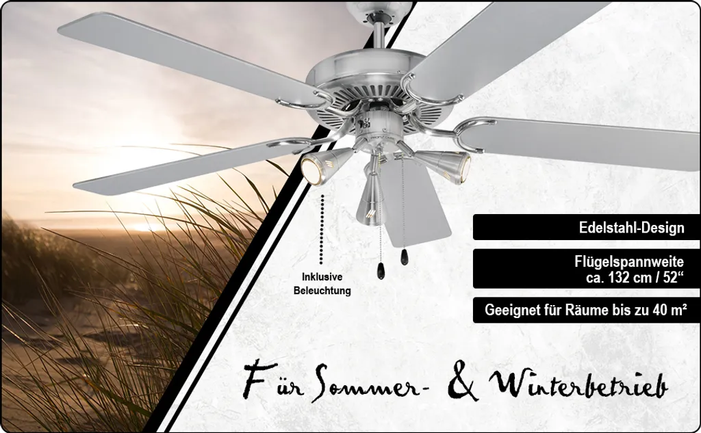 ProfiCare Deckenventilator PC-DVL 3078 5-Flügel-Ventilator Für Räume Bis 40 M² Inkl. Beleuchtung, 4 Leistungs-Stufen, 132cm Durchmesser, 60 Watt, Edelstahl